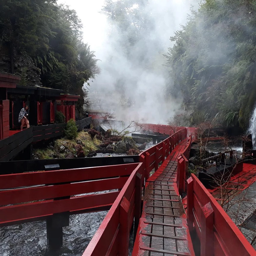 Las Termas Geométricas se destacan por su diseño arquitectónico único, con pasarelas de madera roja que contrastan con la vegetación del lugar y sus múltiples piscinas de aguas termales naturales.